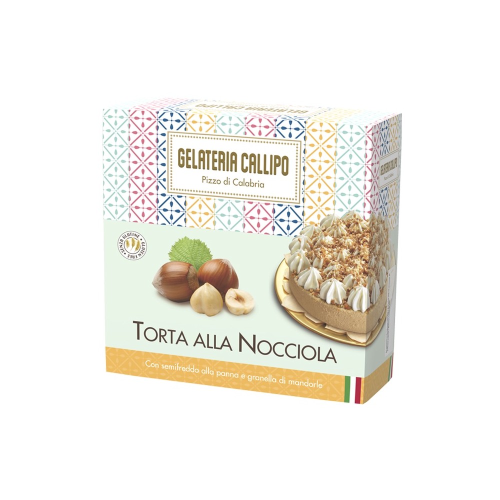 Gelato alla nocciola e semifreddo alla panna si uniscono in questa torta preparata solo con ingredienti selezionati e decorata con un prezioso croccante di mandorle.