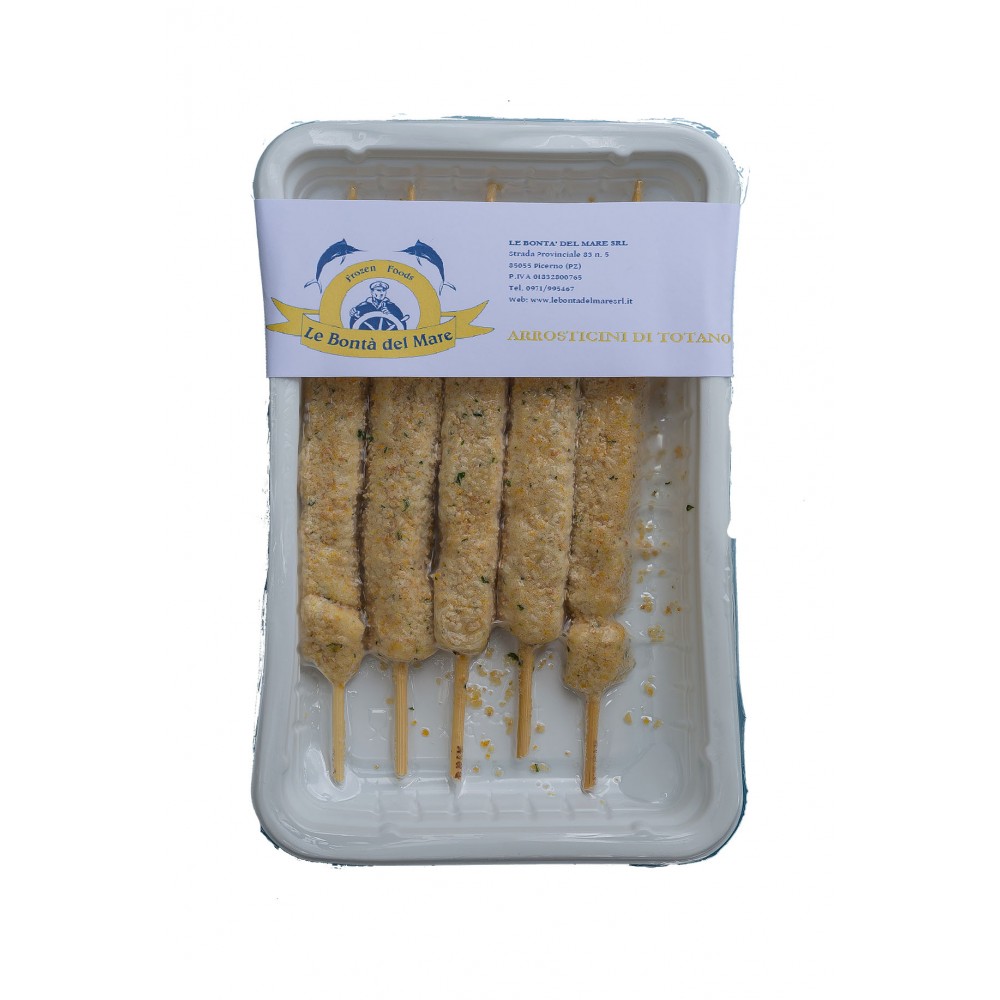 Spiedini di totano gigante (Dosidicus gigas) panati ed aromatizzati.